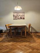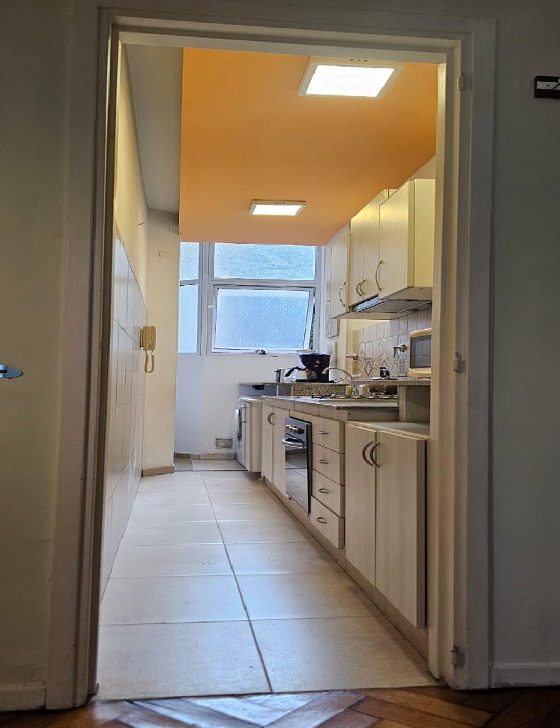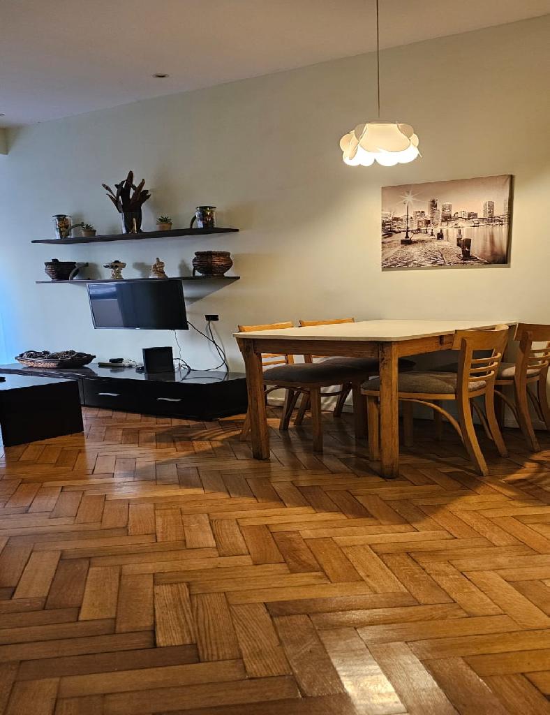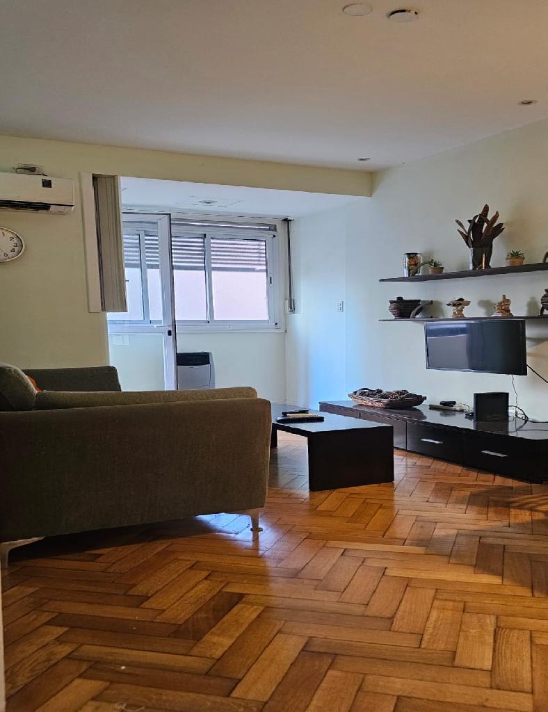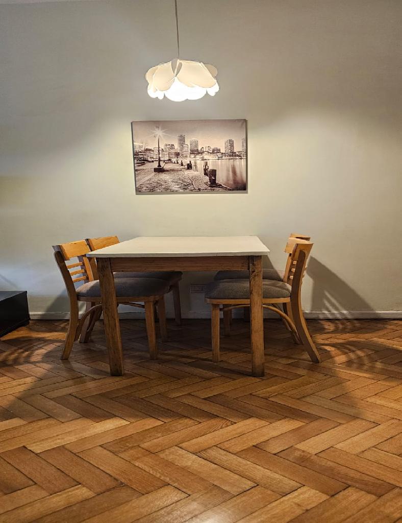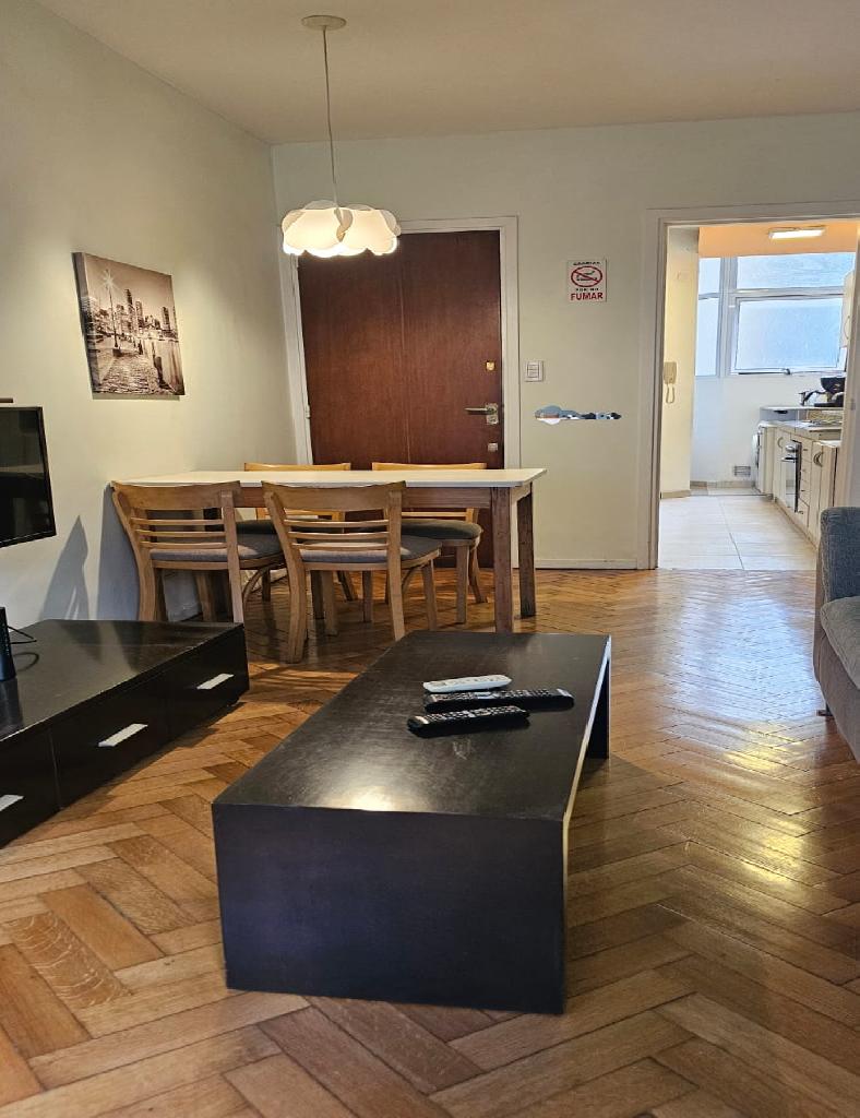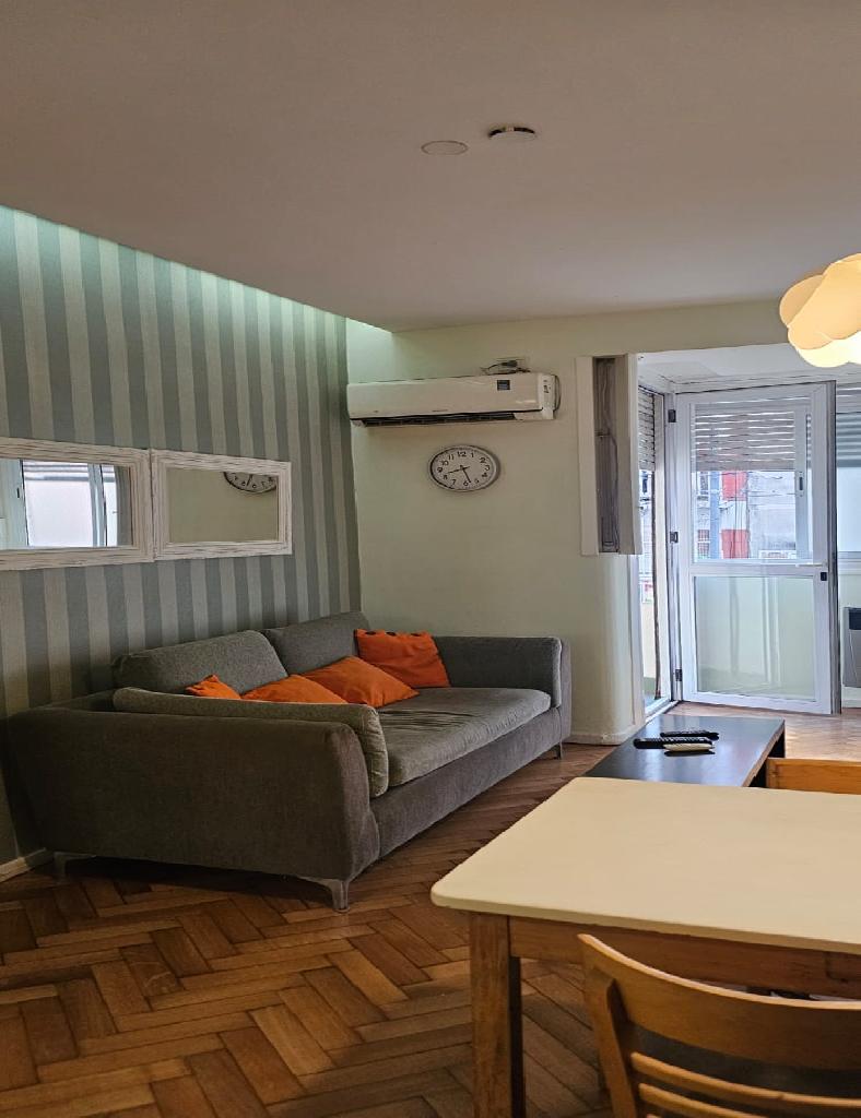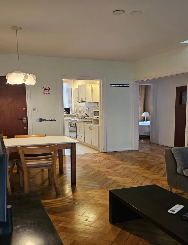Two bedroom apartment in Downtown. The master bedroom has a double bed and with balcony facing the backyar. The second bedroom has two single beds and it faces the street. Between the two bedrooms there is a full bathroom. A living room of 7 x 3.50 with a sofa and table for 4 people with access to a balcony, acing the street. A full equipped kitchen The apartment is very bright, all day. One block from Callao and Corrientes Extra cost of US$2 per day for electricity consumption