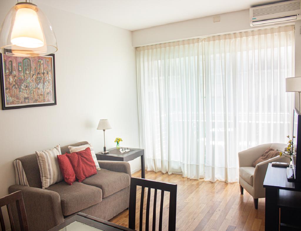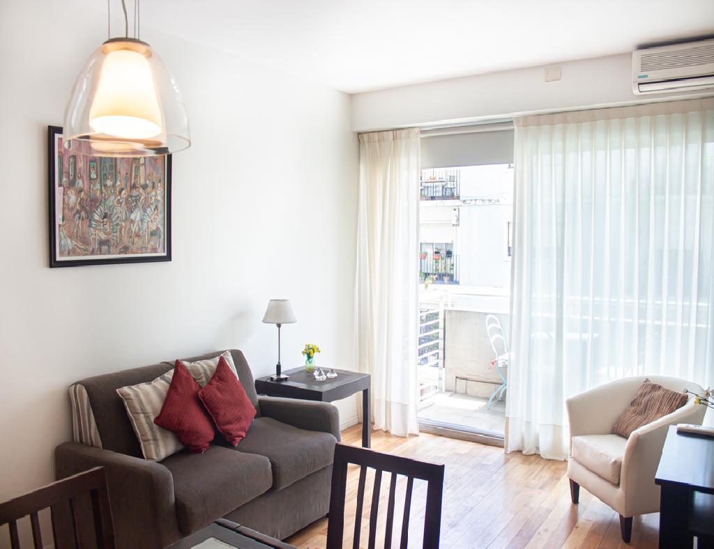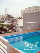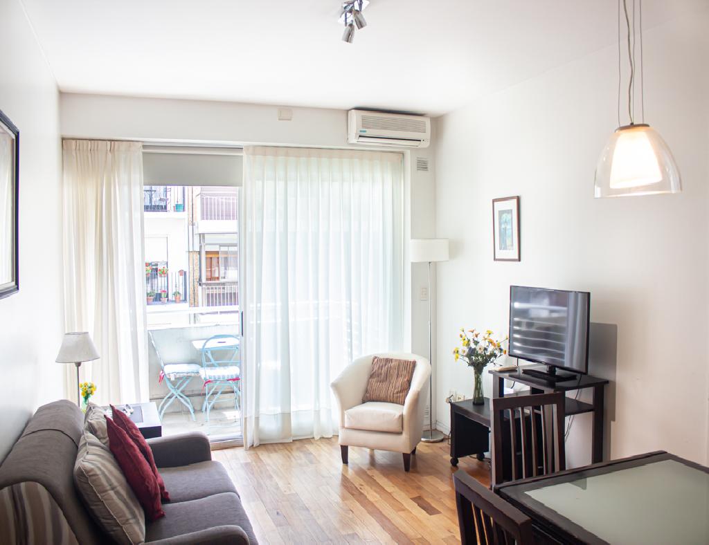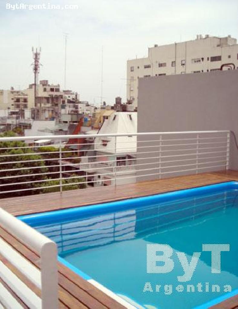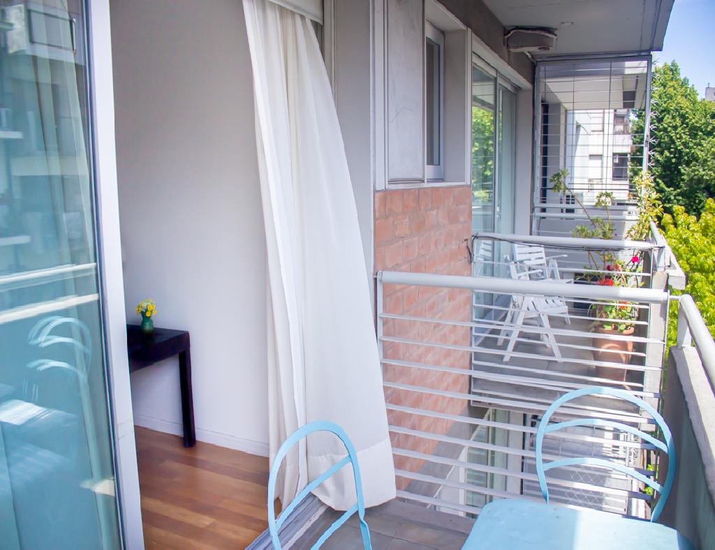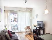 This beautiful one-bedroom apartment is greatly located, just one block away from the Santa Fe avenue, the Alto Palermo shopping mall, and one block from the Charcas Boulevard with its several restaurants and coffee-shops. The area is surrounded by good restaurants, cinemas, shops and public transportation. Subway is also available one block away. The flat offers a living-dining room with a sofa-bed and a dining table for four people, one bedroom with a double bed, walking closet an equipped open kitchen, washing machine, one full bathroom, one half bath and a lovely balcony facing the street. The apartment is equipped with Internet (WiFi), cable TV, stereo, air conditioning, refrigerator with freezer, coffee maker, toaster, wshing machine, dishes, kitchenware, linens and towels. The building has a swimmming pool on the terrace (available only in summer season), solarium and gym. This is a great option, in a brand-new modern building and superbly located. Maid service every fortnight