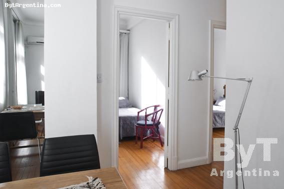 This very nice two-bedroom apartment is centrally located in the Buenos Aires downtown and the financial district, well-known for its theaters, surrounded by restaurants and cafes, just one block from the famous Florida street (pedestrian) and the Galerias Pacifico Shopping Mall. The apartment offers a living-dining room with a sofa and a dining table for four people, the master bedroom with a double bed, a second bedroom with two single beds (convertible into a double bed upon request), an equipped kitchen and one full bathroom.The apartment is equipped with Internet (WiFi), cable TV (32" LED set, features HD channels), air conditioning in the living and in the first bedroom, under current fridge with freezer, microwave, dishes, kitchenware, linens and towels.