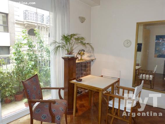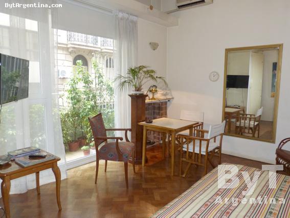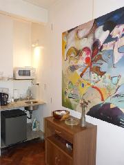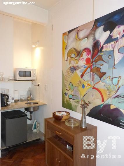 Agradable estudio de ubicación céntrica sobre la calle Maipú, recientemente convertida en peatonal, a sólo una cuadra de otra peatonal, la famosa calle Florida, del centro comercial Galerías Pacífico, y cercano a la elegante Plaza San Martín y la emblemática Av. 9 de Julio. El apartamento ofrece un área de cena, un sector de dormitorio con dos camas twin (convertibles en cama queen como se muestra en las fotos), una cocina estilo kitchenette con heladera, microondas, tostadora y cafetera (sin hornallas), y un baño con ducha. Está equipado con acceso a Internet (WiFi), TV por cable, aire acondicionado, vajilla, sábanas y toallas. Este apartamento cuenta con ventanas de doble vidrio para reducción de ruidos externos. Un teléfono celular es provisto (tarjetas prepagas con cargo)