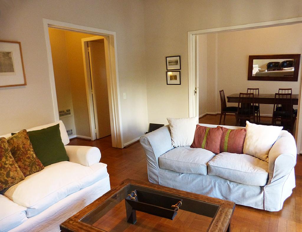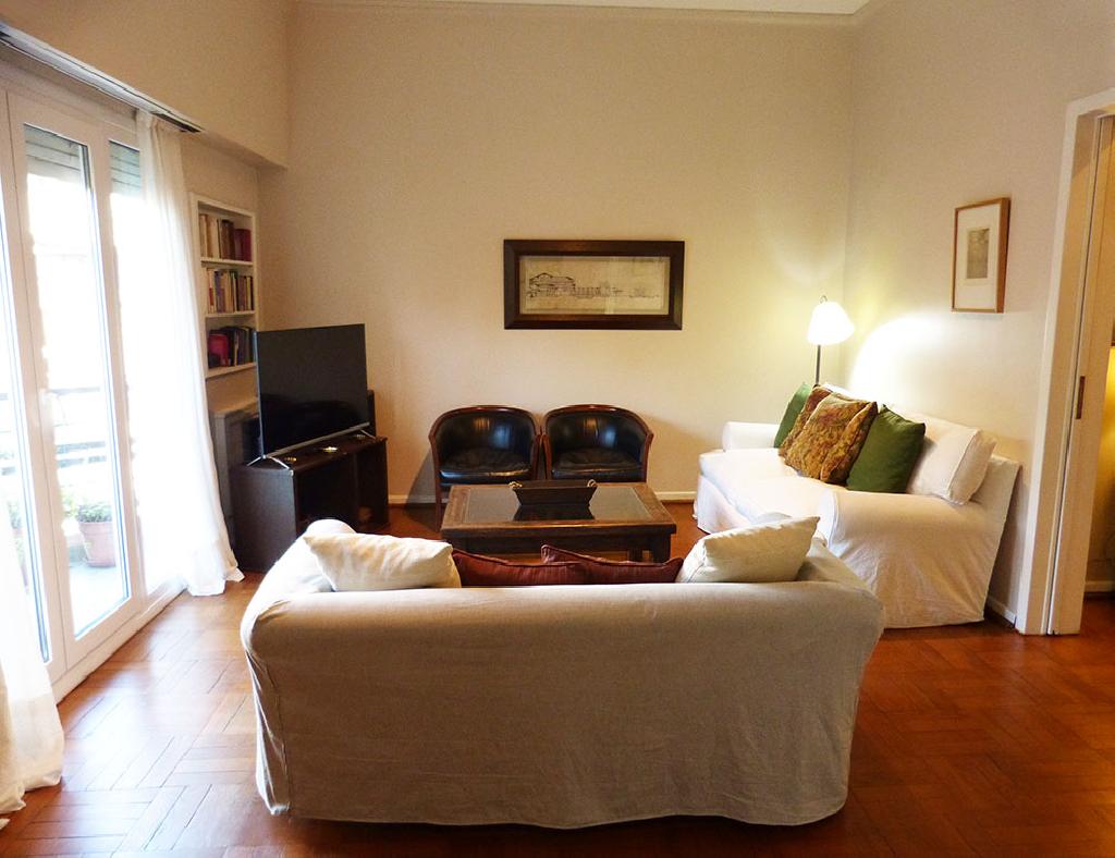 This spacious three-bedroom apartment offers an amazing view on the park. It is greatly located in the Recoleta district, just one block away from the Santa Fe avenue, surrounded by museums, cultural centers, coffee-shops, restaurants, cinemas, and shopping areas. The flat has a large living room with comfy sofas, a dining room with a table fro four people, the master bedroom with a king size bed, a second bedroom with two twin beds, a third bedroom with a single bed, two bathrooms (one of them with bathtub, and the second one with shower), an equipped kitchen and a balcony with a nice view. The apartment is equipped with Wi-Fi internet access, cable TV, fridge with freezer, microwave, dishes, kitchenware, linens and towels. A great option, very comfortable with an excellent location. MINIMUM STAY OF 60 DAYS.