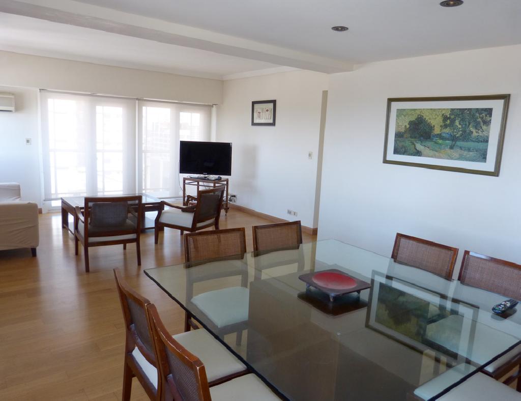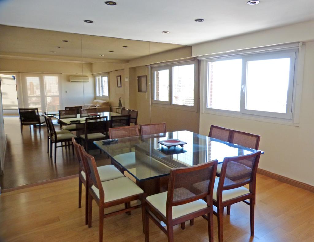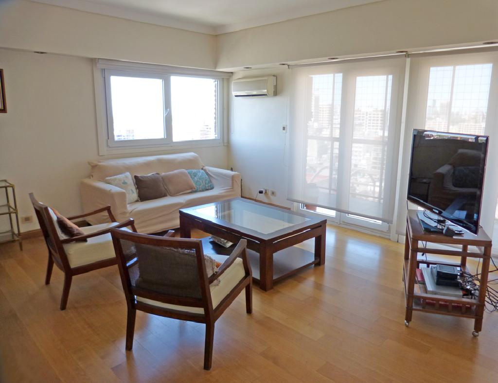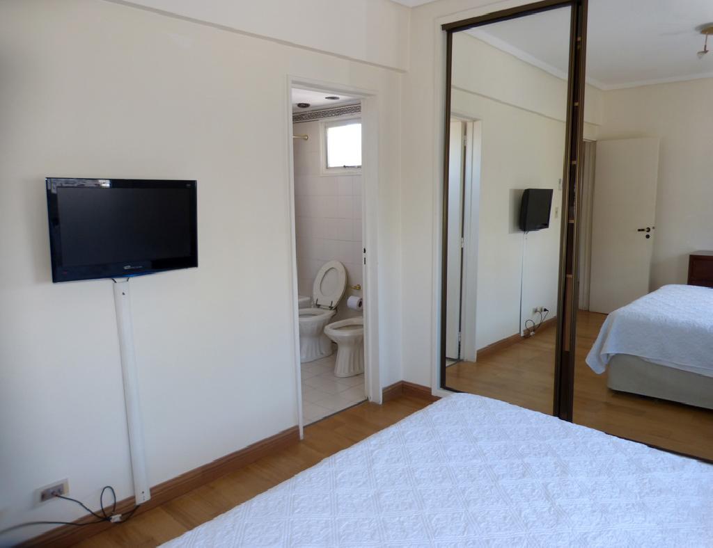 This beautiful two bedroom apartment on the 19th floor offers an amazing panoramic view. It is located in the heart of the Belgrano neighborhood, just a few steps from Av. Luis Maria Campos. The apartment offers an spacious living-dining room with a sofa and table for eight people, the master bedroom with a queen bed and en suite bathroom, a second bedroom with two twin beds, an equipped kitchen, a second full bathroom with shower, a maid bedroom with its own bathroom and nice balcony. It is equipped with Internet access (WiFi), cable TV HD , air conditioning, refrigerator with freezer, microwave, washing machine, dishwasher, kitchen utensils, sheets and towels. The building has a 24 hour doorman and parking.